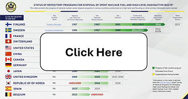 The interactive table below summarizes the progress in developing repository programs around the world for the disposal of spent nuclear fuel and high-level radioactive waste. For the 14 countries listed, the table shows the major milestones reached and estimated dates for future milestones.